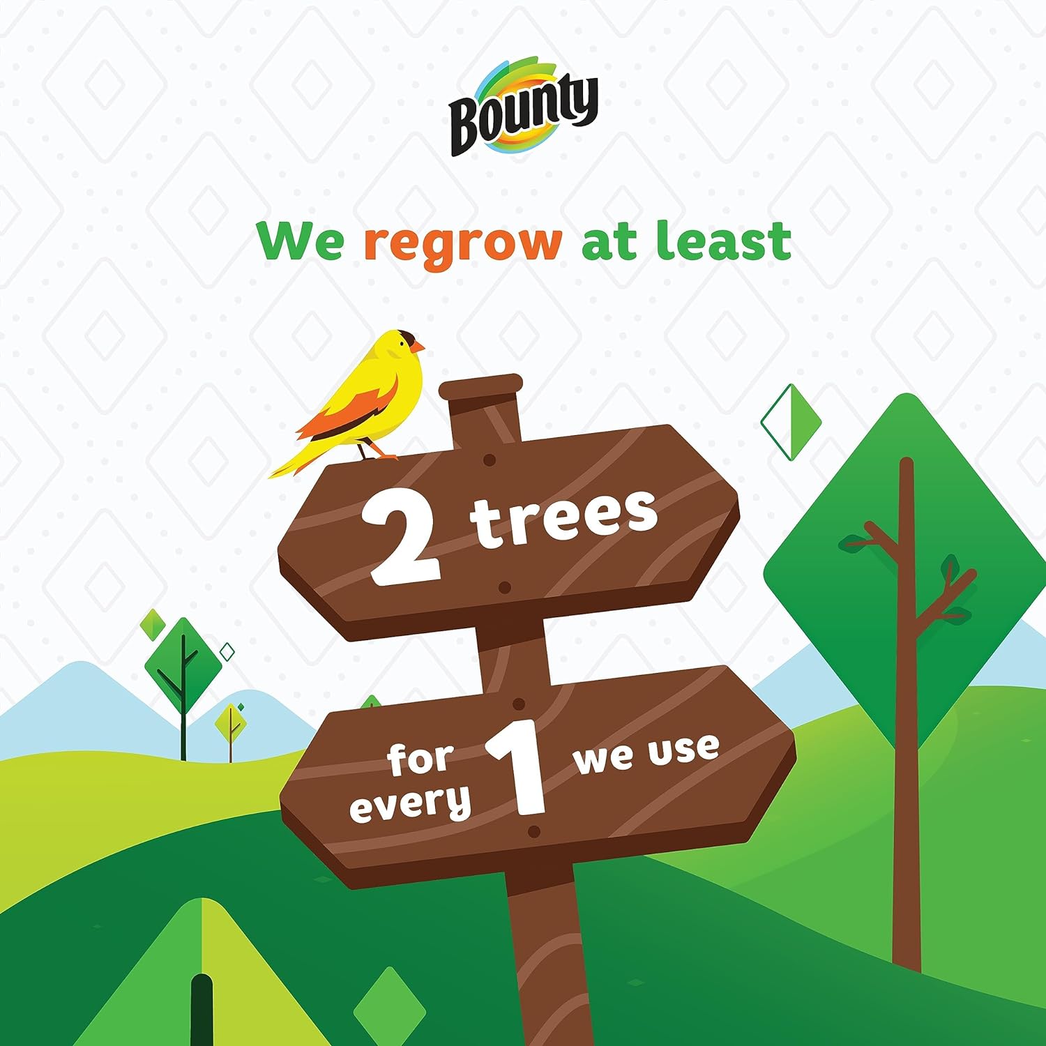 Protect. Grow. Restore.At Bounty, we make paper towels that pick up quicker. And we also help keep forests greener. | Protect.We proudly help protect forests by only sourcing pulp from 100% third party certified lands. | Grow.For every tree we use, we regrow at least two more in its place so we can continue to grow lush and thriving forests. | Restore.We are partnering with conservation organizations to help restore forests and protect wildlife. |