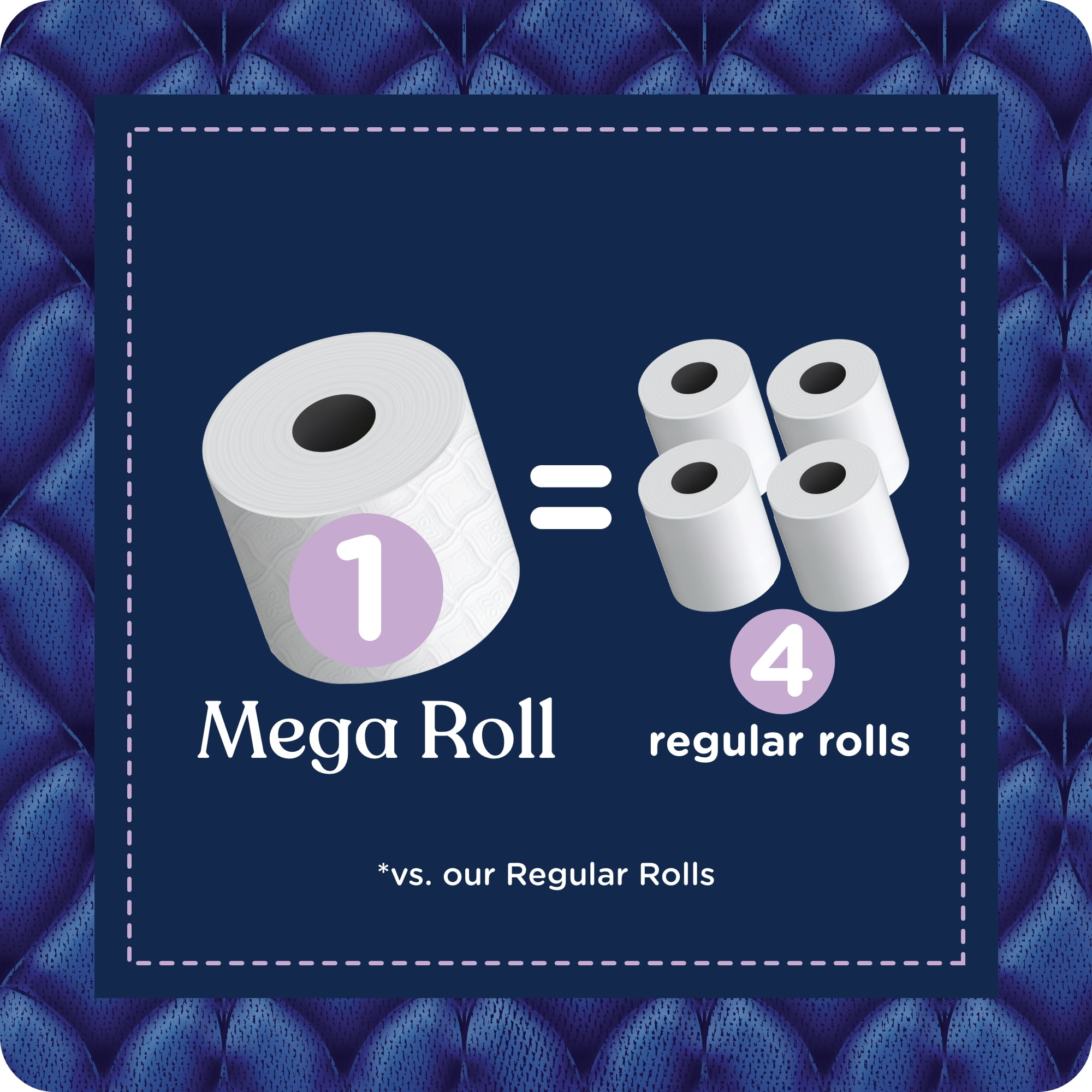 When you purchase this item, you will receive 12 mega toilet paper rolls (equivalent to 48 regular rolls). Each mega roll has 255 sheets, so in total you are getting over 3,000 sheets of Quilted Northern Ultra Plush toilet paper! With more sheets and longer-lasting rolls compared to Quilted Northern regular rolls, this means less trips to the store to restock.